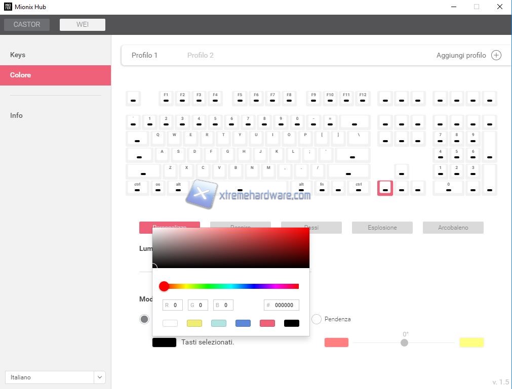 In ‘’Colore’’ entriamo nella gestione della personalizzazione della retroilluminazione RGB per singolo tasto della Mionix Wei. Di default avremo 4 Profili preimpostati che sono ‘’Arcobaleno’’, ‘’Esplosione’’, ‘’Passi’’ e ‘’Respiro’’. Presente anche ‘’Personalizza’’ per consentirci una personalizzazione approfondita dei singoli tasti e colori. Potremo regolare anche l’intensità della retroilluminazione (opzione possibile anche dal tasto dedicato sulla tastiera).