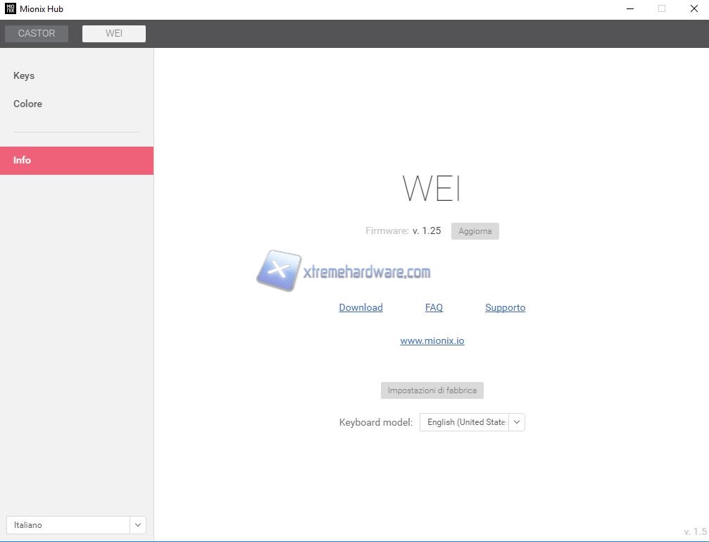 Infine in ‘’Info’’ troviamo un riepilogo del modello con relativo Firmware installato e aggiornabile in caso di nuove release (noi siamo passati da quella di default v1.23 all’ultima v1.25). Potremo raggiungere anche il sito Mionix e relativa pagina di supporto.
